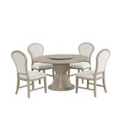 The Gwendolyn Round Dining Set blends modern elegance with timeless craftsmanship. Made from solid rubberwood and oak veneers, it features an 54" round table with a built-in Lazy Susan and four upholstered arm chairs. A sculptural curved base and cerused taupe finish offer a soft, versatile look that suits a range of interiors. Plush padding and clean lines provide a comfortable, contemporary dining experience with lasting quality.