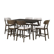 The Rex Mid-Century Modern Wood Counter Dining Set combines sleek design with everyday practicality, making it a great choice for both casual meals and gatherings. This set includes a spacious counter-height table and matching counter stools, all crafted from solid rubberwood, manufactured woods, and oak veneers for durability and long-lasting use. The minimalist design, with clean lines, rounded edges, and angled, tapered legs, captures the essence of classic Mid-Century Modern style. Finished in a rich, hand-rubbed walnut brown with a clear topcoat, the set highlights the natural beauty of the wood grain. Each stool offers comfortable seating with softly curved backrests and resilient foam cushions wrapped in easy-care 100% polyester fabric. Perfect for larger dining spaces, this table comfortably seats up to six, providing the ideal spot for dining and conversation.