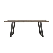 Perfect for a loft apartment, this industrial style dining table offers a mixed material design. Built with a solid grey sheesham and mango wood, this table was made to last in any home. Plus, with an intricate hand-crafted herringbone pattern inlay, this table is sure to take center stage. The spacious and rectangular tabletop surface offers seating for up to six people and is supported by a flared leg base in an iron gunmetal finish. Available within the same Misty collection are matching chairs, bench, and dining server to complete an entire rustic dining room ensemble.