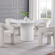 Bring polished sophistication and lasting durability to your kitchen or dining room with a modern dining table. It's crafted from sintered stone, a synthetic surface crafted from minerals exposed to heat to create an authentic look for white marble. Subtle grey veins add depth and detail to the table top. Underneath, a white finished pedestal features a round silhouette and vertical reeded details that add contrasting texture to the smooth table top. This striking dining table is an elegant choice, offering fresh, clean ambiance to your breakfast nook or dining room.