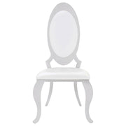 This dining chair blends classic form with modern materials for a bold statement. An oval backrest and gently flared silhouette evoke traditional influence, while the stainless steel frame and Queen Anne cabriole legs add a sculptural presence. Upholstered in smooth white faux leather, the cushioned seat and back provide comfort with easy care. The polished chrome finish completes the look with reflective shine and visual contrast.