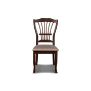 The Bixby Wood Splat Back Dining Chairs, available as a set of two, combine timeless style with lasting durability, making them a perfect addition to both formal and casual dining spaces. Expertly crafted from solid Rubberwood, these chairs are built to endure while showcasing the natural beauty of wood. The rich espresso cherry finish, meticulously hand-applied in a multi-step process, highlights the wood’s grain patterns and adds a subtle, sophisticated sheen. The chairs feature a refined splat back design, with a gracefully curved top rail and artfully fanned vertical slats, enhancing their elegant appeal. For comfort, the high-density foam cushions are covered in easy-care 100% polyester upholstery, ensuring both durability and practicality. Brass nailhead trim adds a touch of classic craftsmanship, making these chairs a stylish and functional choice for any dining setting.