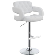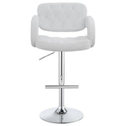 Expressive and interesting design elements team up to deliver a fun look. Make a modern or transitional space flush with style. This bar stool borrows from a retro theme with a hint of barbershop charm. An ergonomically positive seat. A bright, shiny chrome base with a bar footrest looks sleek and dynamic, and adjustable seat heights accommodate a bar table or counter.