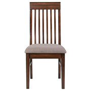 Punctuate a stylish dining table ensemble with a set of two modern side chairs. Each features a solid, stately silhouette with a mango oak wood finish that's dark and rich, perfect for friends and family alike. The chairs features tall, slatted backs, with gentle curvature that provides added comfort and support. Seats are padded with foam and upholstered in light brown fabric that's soft and neutral to complement in any setting. The chairs come in sets of two, perfect for creating a custom arrangement with the coordinating table or your existing dining table.