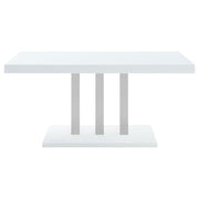 Give your entertainment area an ultra-modern feel with this five-piece dining table set. A spacious rectangular table with a gleaming high gloss white finish is supported by three stainless steel supports in a lustrous chrome finish that rest on a flush base that mirrors the top. With a pedestal-like design, the dining table invites each of the four cantilever style dining chairs to slide up for meals and conversations. Sit back and rest in the upholstered seats, wrapped in a two-tone gray and white leatherette that accents the contoured shapes. Mounted on a polished chrome metal base, the cantilever design chairs also offer an open, airy feel that showcases the table.