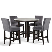 The Celeste 5-Piece Counter Dining Set is an exquisite combination of modern sophistication and enduring craftsmanship. This set includes a chic 42-inch counter table with an espresso base and a faux marble top, accompanied by four stunning gray velvet chairs. Crafted from solid Rubberwood and high-quality manufactured wood components, the dining set is designed for longevity, ensuring a lasting addition to your dining space. The glossy finish on the tabletop provides both heat and water resistance, ensuring easy cleaning and protection from wear. The white and gray veined faux marble top, complemented by deep espresso legs, creates a contemporary and glamorous ambiance. Luxurious seating awaits with the soft and durable 100% polyester velvet fabric covering sumptuous memory foam cushions, offering both comfort and easy maintenance. The stability of the counter chairs is enhanced by four base stretchers, which double as convenient footrests. Tailored for elegance, the rich and luxurious colors of the velvet chairs are enhanced by silver nailhead trim, providing a sparkling final touch to this impeccable dining set. Elevate your dining experience with the Celeste counter dining set—a fusion of contemporary glamour and enduring quality.