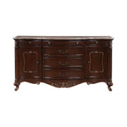 The Royal Classics Constantine Sideboard / Server in cherry combines heirloom craftsmanship with functional elegance, making it a refined addition to any dining room. Expertly crafted from solid pine and premium fancy face birch veneers, this piece ensures lasting beauty and durability. The multi-step finish enhances the natural wood grain, while delicately burnished gold tipping highlights the intricate carvings, adding a touch of luxury to its design. Inspired by 18th-century Rococo style, the sideboard features ornate ornamentation and carvings that bring a sense of regal sophistication to your home. The genuine marble top follows the furniture's graceful curves, while bowfront drawers and cabriole legs complete its lavish look. For practical use, the sideboard offers three velvet-lined drawers for flatware, spacious open shelving behind doors for bulkier items, and additional drawers for table linens or hosting essentials—making it both elegant and versatile, perfect for organizing and showcasing in style.