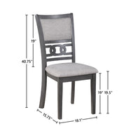 Enhance your dining space with this set of two New Classic Gia Wood Dining Chairs in a rich finish. Crafted from solid Rubberwood and Mindi veneers, these chairs offer a perfect blend of durability and aesthetic appeal. The finish achieved through a multistep process and clear coat, highlights the exquisite wood grain. Designed for comfort and longevity, the chairs feature easy care 100% polyester upholstered cushions and backs supported by sturdy solid wood legs. The transitional style, characterized by interlocking chain chair back detail, tapered legs, and clean lines, seamlessly complements any dining room decor. Assembly is a breeze with all necessary hardware and clear instructions included. With a one-year warranty, these dining chairs are a practical and stylish addition to your home. Invest in quality and style with the Gia Wood Dining Chairs.