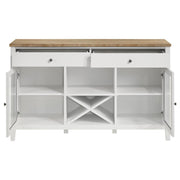 Wire brushing adds the perfect hint of rustic distressing to the table top featured on a modern farmhouse sideboard. Its two-tone look adds charm in a kitchen or dining room, with a natural wood top and crisp white base that adds contrast while maintaining a neutral color palette. Two drawers are ideal for utensils and delicate items with felt lining in a light brown hue. Two side cabinets add glass doors for showing off cookbooks, crockery or glassware. In the center, one open shelf and an X-cross bottle rack add a perfect spot for favorite bottles of wine and stylish decor that brings a personal touch.