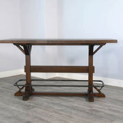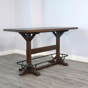 This Homestead pub table was built with mahogany and mindi solids and veneers. Its design suggests contemporary with industrial trades and its metal foot rail gives it a very unique look and practicality.