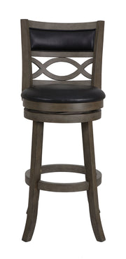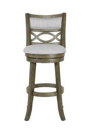 The New Classic Furniture Manchester Pub Height Swivel Bar Stool is a functional and durable seating solution designed for comfort and style. Crafted from quality Rubberwood solids and manufactured wood, ensuring long-lasting strength. Featuring a seat height of 29”, the stool's legs are reinforced by a circular footrest, providing added stability and functionality. With a 360-degree swivel, this barstool effortlessly rotates for convenient use at kitchen islands or bars. The full foam seat cushions and backrests, upholstered in easy-care light gray 100% polyester fabric, offer a plush and cozy seating experience. The distinctive interlocking wave wood back and thickly welted upholstery add a touch of sophistication to the overall design. Easy assembly is a snap with the included instructions. Elevate your bar, counter, or kitchen island with the Manchester Bar Stool, where durability meets distinctive style.