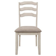 Enhance the cozy atmosphere of your dining space with our modern farmhouse and coastal cottage dining side chairs. These ladder back chairs exude a charming rustic appeal with their distressed cream finish on the legs and back. The khaki polyester fabric upholstered seat ensures optimal comfort during meals.