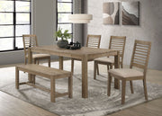 Modern farmhouse dining set creates a warm, inviting ambiance in your kitchen or dining room. It's a fresh look with timeless underpinnings, showing off clean, straight lines and a versatile washed brown finish. Wire brushing adds depth and creates texture, perfect for a welcoming space for meals with friends and family. The rectangular table is complemented with side chairs, each with a ladderback that adds updated allure to the set. Chairs are complete with foam padded seats and latte upholstery, complementing the stylish, casual palette of the set to perfection.
