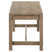 Introduce casual character with a modern farmhouse dining bench. The backless design features a trestle base detail and wooden seat, creating a simple, inviting look. It's crafted from rubberwood and features a washed brown finish. Wire brushing adds texture and depth. Square post legs provide excellent support.