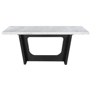 Bring together family and friends at this modern style dining table set. The table features a thick, marble top that is spacious enough for six people. Sleek open and airy trestle base with a center punch out, rustic striking color combination lends a dramatic touch and grounds the room elegantly. The set of chairs with a rolled backrest with button-tufted details lends a traditional aesthetic to a space. Also, bringing to your home the classic elements is a padded seat with individual nailhead trim that offers a charming detail.