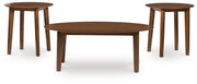 Stylish simplicity teams up with mod flair to define this table set. A versatile and inviting brown wood-tone finish on the coffee table and end tables enhances the stunning wood grain character. Rounded tops polish off the design with a dash of mid-century appeal.