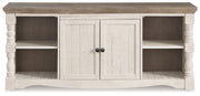 Set your sights on modern farmhouse style with this XL TV stand. Distressed two-tone treatment blends a weathered gray with vintage white for an utterly charming effect. Turned posts lend a hearty, substantial look that feels right at home, while plenty of open shelving makes the aesthetic anything but heavy.