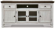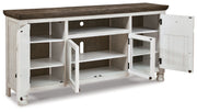 Have your fill of modern farmhouse style with this TV stand. Its distressed two-tone finish pairs a vintage white with a weathered gray for a look that’s utterly charming. Right and left cabinets open to reveal adjustable shelving for all your entertainment center storage needs. Center glass doors add to its relaxed appeal.