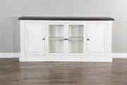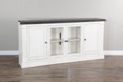 This media wall is a must-have for all entertaining rooms. You can fit an eighty-inch TV within the hutch, and an eighty-five-plus inch TV without its shelf. Made in Indonesia with mindi solids and veneers.