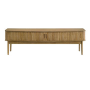 With graceful curves and rich texture, this mid-century inspired media console becomes an understated centerpiece. Reeded sliding doors ripple gently across the front, adding quiet rhythm to its softened silhouette. The weathered natural finish warms the room like sunlight through wood grain, while open shelving within offers thoughtful space for your favorite pieces. Crafted from solid rubberwood and engineered wood, and perched on tapered legs, it brings both elegance and ease to any curated living space.