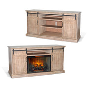 This TV console with farmhouse style sliding barn doors is a perfect addition to any entertaining space. This unit can be used with a fireplace insert (not included) and turned into a cozy fireplace, or it may be used to place your media electronics.