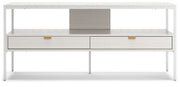 Bring your vision of a modern living room to life with this sleekly designed TV stand. Its linear construction and white finish keep things minimal. An open shelf and two drawers allow you to store in simply streamlined style, rounding out this versatile, striking piece.