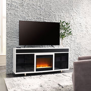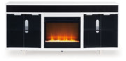 Combining a white high-gloss finish with black glass doors, this TV stand proves opposites really do attract. It's the perfect blend of modern style and functionality, with ample space for your media devices, flat-screen TV and soundbar. Adding that much more show-stopping style, the electric fireplace insert operates with or without heat and includes a six-level temperature setting, a remote control and an overheating control for added safety. It comes with faux glass crystals and natural stones, so you can customize the look of the flame bed.