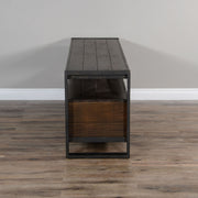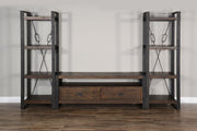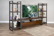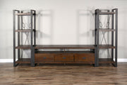This media wall is a must-have for all entertaining rooms. You to fit an eighty-inch TV within the hutch with its shelf, and an eighty-five-plus inch TV without it. Made in Indonesia with mindi solids and veneers.