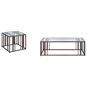 This coffee table set includes a rectangular coffee table and a matching end table, both featuring tempered glass tops and geometric bases crafted from heavy-gauge metal. The open-frame design exudes modern elegance while offering durability and functionality. Scratch-resistant materials ensure lasting quality, making the set ideal for organizing essentials or displaying decor. Its cohesive design provides a sleek, contemporary look for any living room.