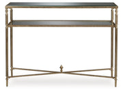 This sofa table gives traditional design a wonderful sense of relevance. Its details, which include embellished legs and a stretcher with a decorative center finial, are timeless classics. The aged goldtone coloration is the essence of relaxed elegance. An underlying shelf adds style, substance and functionality.