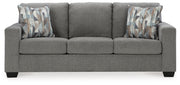 You’re in for a neat treat with this sofa. Its comfy seats are covered in soft, textural upholstery, and the wide track arms are eager to support your quest for total relaxation. Distressed abstract toss pillows bring a fresh breath of contemporary style while accentuating the sofa's color.