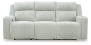 Trend-right style, meet irresistible modern function. Your living room gets a cozy-cool upgrade with this power reclining sofa. Curl up in its ultra-chic corded upholstery and recline with one-touch controls. Is it movie night or game time? With ambient LED lighting and wireless audio connectivity, this sofa transforms from a serene relaxation spot to an entertainment hub. Its drop-down table, USB charging and cup holders make lounging all the more convenient.