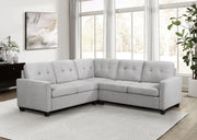 Entertaining is a breeze with a transitional style motif as the sectional set assembles pieces forming an L-shaped sofa, ideal for family rooms and media venues. Classic design elements are pleasing, as wood framing forms a straight box base and slender track arms. Gorgeous fabric upholstery opens up options for blending with room color palettes. Sit in relative luxury on foam-padded attached seat cushions and against reversible back cushions, all with subtle tufting. Chunky wood feet deliver a fun iconic embellishment to a set that includes one corner chair, one left-facing loveseat, and one right-facing loveseat.