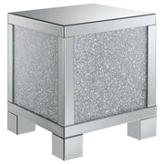 This 20-inch square mirrored end table brings a touch of glam to any space. Its engineered wood frame is adorned with shimmering acrylic crystal accents, adding sparkle and elegance. Fully mirrored surfaces enhance light and dimension, while the clean, square silhouette delivers sleek, contemporary style. Perfect as a functional or decorative piece, this table elevates your living room with luxurious glamor.