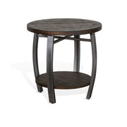 This Homestead end table is a barrel-inspired design built with rough sawn mahogany tops and shelves. Their metal structures are powder-coated for durability and beautifully and dynamically curved.