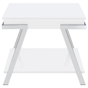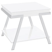 Complete your living room with this modern coffee table and end table set. Pieces feature a high-gloss finish and angled chrome legs, delivering a clean, cohesive aesthetic. The coffee table includes a lift-top for hidden storage and a lower shelf, while the end table offers a convenient storage shelf. Built with engineered wood and durable metal, this stylish set blends contemporary design with functional appeal for trendy, practical spaces.