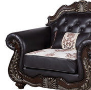 The Royal Classics Maximus Living Room Arm Chair is expertly crafted to combine timeless beauty with exceptional durability. Made from solid pine with premium polyurethane carvings, this armchair is both lightweight and robust, resistant to moisture, rot, and cracking, ensuring its intricate details endure over time with minimal maintenance. The meticulous multi-step cherry finish enhances the natural wood grain, while delicately burnished gold tipping highlights the ornate carvings, adding a luxurious touch. Inspired by traditional Baroque design, the chair features Rococo-style ornamentation, bringing a sense of regal elegance to your home. Upholstered in rich brown vegan leather, the chair is complemented by elegantly patterned, soft-textured accent pillows that enhance its refined look and offer a plush, inviting feel. Button-tufted backs and nailhead trims trace the graceful curves of the wood frame, providing exquisite attention to detail. The upholstery backs and bases are shipped separately for hassle-free transport and easy setup, making this armchair both practical and a statement piece for any sophisticated living space.