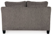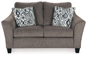 This loveseat sets the scene for a modern space full of casual flair. Its textured chenille with solid microfiber upholstery provides a luxuriously soft feel that’s inviting. Gently flared arms and plush seat cushions welcome comfort and relaxation. The on-trend slate-colored upholstery offers a perfect background for the two decorative pillows to pop with beauty.