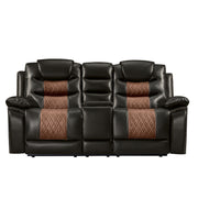 Experience the perfect blend of comfort and functionality with the Nikko Dual Recliner Storage Console Loveseat with Hidden Cupholders . This loveseat, constructed with hardwood and plywood frames, ensures long-lasting durability and stability. The combination of resilient foam cushions and pocket coil support offers a luxurious, cozy place to lounge. The two-tone fabric, made from 80% polyester and 20% PU, provides the soft touch and look of leather while remaining breathable. Featuring distinctive details like nailhead trim, diamond stitch pattern seats, double wrapped headrests, and expert tailoring, this loveseat stands out in any home. Practical lifestyle features include extra storage in the center console and hidden pull-out cupholders under the armrests. Enjoy ultimate relaxation with plush pillowed arm and headrests, reclining backs, and comfortable footrests. Indulge in unparalleled comfort and style in your home with the Nikko Reclining Loveseat.