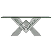 This mirrored coffee table set brings modern luxury to any living space. Featuring a coffee table and matching end table, both pieces boast bold V-shaped bases adorned with mirrored panels and glittering crystal accents. The coffee table’s rectangular glass top and the end table’s square top provide sleek, beveled tempered glass surfaces for added elegance. A perfect combination of glamour and functionality for contemporary interiors.