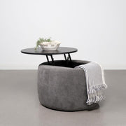 Indulge in the seamless blend of functionality and style with this chic round ottoman. Draped in sumptuously soft grey chenille, it invites relaxation while concealing a spacious storage compartment beneath its sleek black lift-top. Its subtle charm is elevated by the contrast of textures, offering an understated yet sophisticated accent to any living space. Perfect for small spaces, this ottoman combines the comfort of additional seating with the practicality of hidden storage. Envision this versatile piece as the focal point in your room, where convenience meets modern elegance.