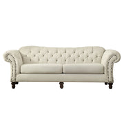 - Cozy-Easy Care Fabric: 100% Polyester natural woven upholstery is carefully tailored and complemented by gracefully shaped backs, button tufting and nailhead trim.