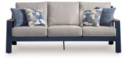Easy-breezy beauty, made to withstand the elements. This outdoor sofa makes a serene statement with its soothing shade of blue and contrasting wood-look arms. A cushioned seat and back keep you comfy as you lounge. Crafted with durable materials for added longevity, it's a smartly stylish addition to your outdoor oasis.