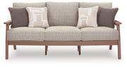 Natural neutrals are all the rage. Embrace the style trend with this outdoor sofa. Crafted with MEGA-TUFF® HDPE material, this chair combines the exceptional durability and weather resistance you need with the wood look you love. Comfy cushions wrapped in our high-performing, low-maintenance Nuvella® fabric offer stylish and durable appeal, taking outdoor living to a whole new level. Coordinating accent pillows add a wonderful layer of interest.