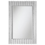 Mount this stunning glam mirror on an entryway foyer wall or above a bathroom vanity for a bit of sparkle. With a long rectangular shape and dimensional frame, this contemporary style mirror is sure to catch the eye. Vertical lines fuse together, half of which are glimmering faux crystals that add to the luxe vibe to create an ultra-refined look. With a shimmering silver finish elsewhere, this breathtaking mirror lends itself to numerous color palettes too. The reflective mirror itself also offers a classic beveled edge for a traditional flair.