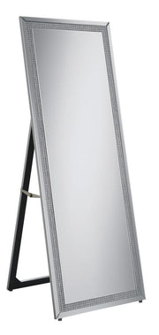 This standing mirror offers a polished balance of function and glamour, framed in sleek mirrored panels with an inset of faceted acrylic crystal inlay. Designed for full-length reflection, its clean rectangular silhouette is supported by an easel back for stable, freestanding use. The crystal trim adds refined sparkle, while the mirrored surface enhances brightness. Perfect for bedrooms, dressing spaces, or closets, this floor mirror brings both clarity and sophistication.