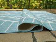 Give your patio, deck or porch an instant makeover with this area rug. Its botanical design features an aqua background with an ivory leaf pattern. This easy-care floor covering is perfect for high-traffic areas, adding a serene vibe to any indoor or outdoor space.