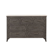 Add a touch of luxury to your bedroom with the Lisbon Marble Top Dresser in Gray. Crafted from Acacia solid wood and eco-friendly embossed oak laminate, this dresser ensures lasting strength and durability. Its multi-step gray finish enhances the natural beauty of the wood, creating a sophisticated ambiance in your room. The genuine white marble top adds distinct character and provides a long-lasting surface. Featuring heirloom drawer construction with English and French dovetail joinery, full extension glides, and finished interiors, this dresser offers both durability and functionality. The top drawers are lined with felt to protect delicate items. With traditional elements like bracket feet and picture frame moldings combined with modern brushed pewter hardware and a fresh gray finish, this dresser offers a timeless style with a contemporary twist. The Lisbon Marble Top Dresser is the perfect blend of elegance and practicality for your bedroom.