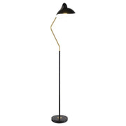 A contemporary floor lamp takes a classic mid-century inspired profile and updates it with modern flair. In black and gold, the lamp boasts a slim post with a V-curved arm that ensures bright downlighting perfect for an armchair or desk. A black metal shade completes the look with a wavy edge and a bright white interior for true lighting. The shade easily adjusts to focus illumination just where you need it. A round base is chic and understated, while a foot switch on the cord makes for seamless operation.