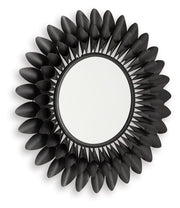 The striking flower power of this accent mirror creates a captivating focal point in your home. Crafted from sleek black metal, the layered petal frame adds depth and dimension. The bold design and easy elegance make it a perfect reflection of your individual style.